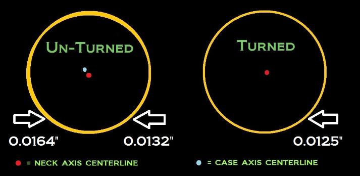 | The wall thickness varies from 0.0164” to 0.0132” or three-thousandths net. When neck sized, the die makes the outside diameter perfectly round. The trade off is it pushes the unevenness to the inside edge. It’ll look like a concentric circle but will be offset to the case centerline. The bullet then deviates from the bore axis and accuracy suffers. But wait it gets better. If your FL sizer has an expander ball it may re-orient the neck on upstroke (since the neck is already out of the die body). Luckily most expanders have a little float built into them so they self-align on the mouth. If not it'll revert to the initial 0.003” o.d. run-out. Kinda like a dog chasing his tail isn’t it? |