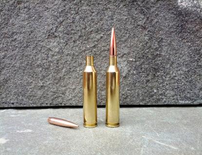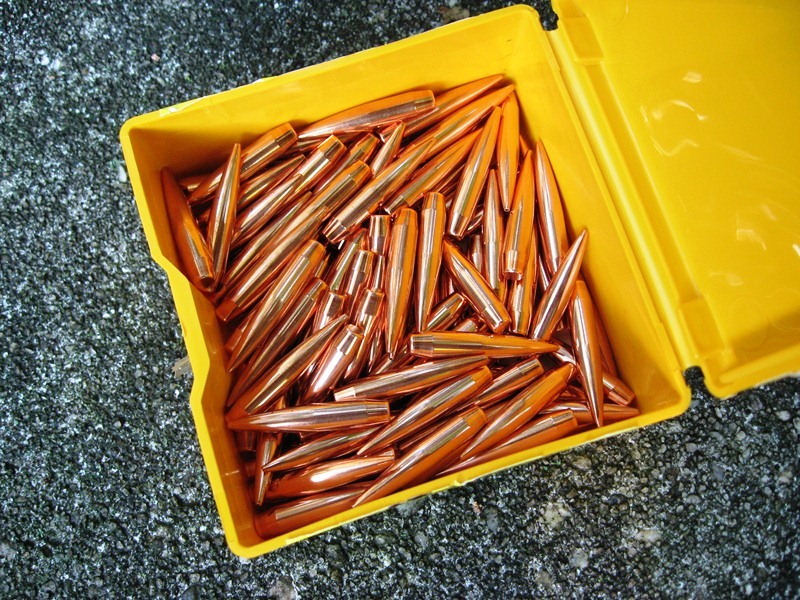 | Initial hi-perf loads were assembled with US 869 and Retumbo. Each was topped with Berger’s excellent very-low-drag (VLD) 90 grain boat tail. These bullets set sleek on its ear. 15 ogive pointed and with a 0.551 G1 ballistic coefficient they’re damn close to wind defying. Berger forms them with J4 jackets so wall consistency <= 0.0003”. Perhaps they should include the phrase “match grade” when packaging. |