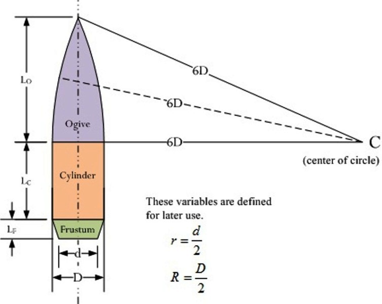| Overall cartridge length (OAL) is a widely cited metric. While relevant for magazines and feeding, it means very little to the accuracy crowd. Bullet curvature in relation to the lands does and for that reason I use ogive inserts. Here’s how they work. The point in which a bullet engages the rifling depends on its ogive. By definition ogive is the forward curved area between the tip and shank. That curve is the segment of a circle with radius “r”. Ogive denotes the number of calibers required to equal that “r” value. So a 7 ogive 6mm bullet has a circular arc segment with r = 1.701” (7x 0.243”). |